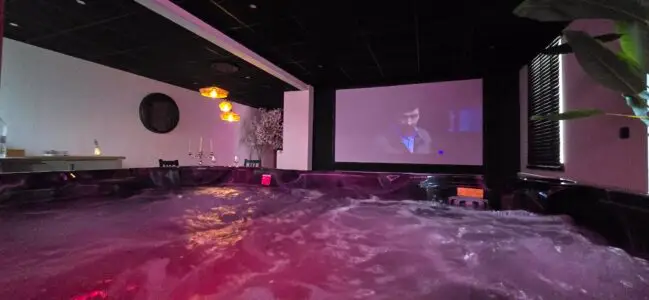 L’expérience est sublimée par une ambiance lumineuse soignée et un écran géant visible depuis le jacuzzi, pour un moment de relaxation absolue, de jour comme de nuit.
